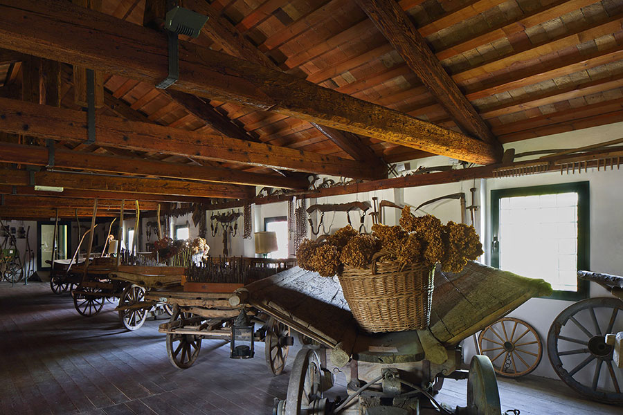 Starting from the old courtyard – once at the heart of agricultural life – you can visit the buildings that overlook it. The barns and former granary showcase an unusual collection of machinery used in ancient times in the fields, farmhouses and villa.