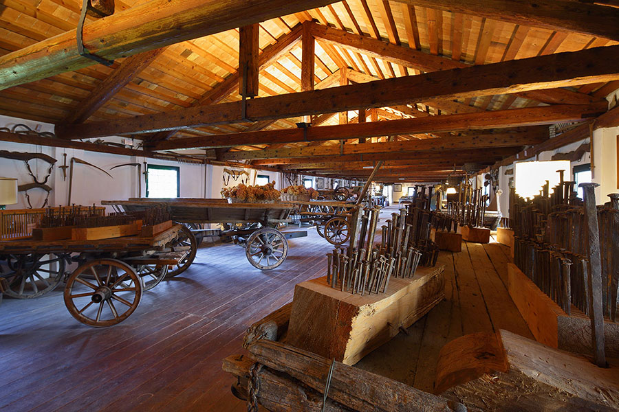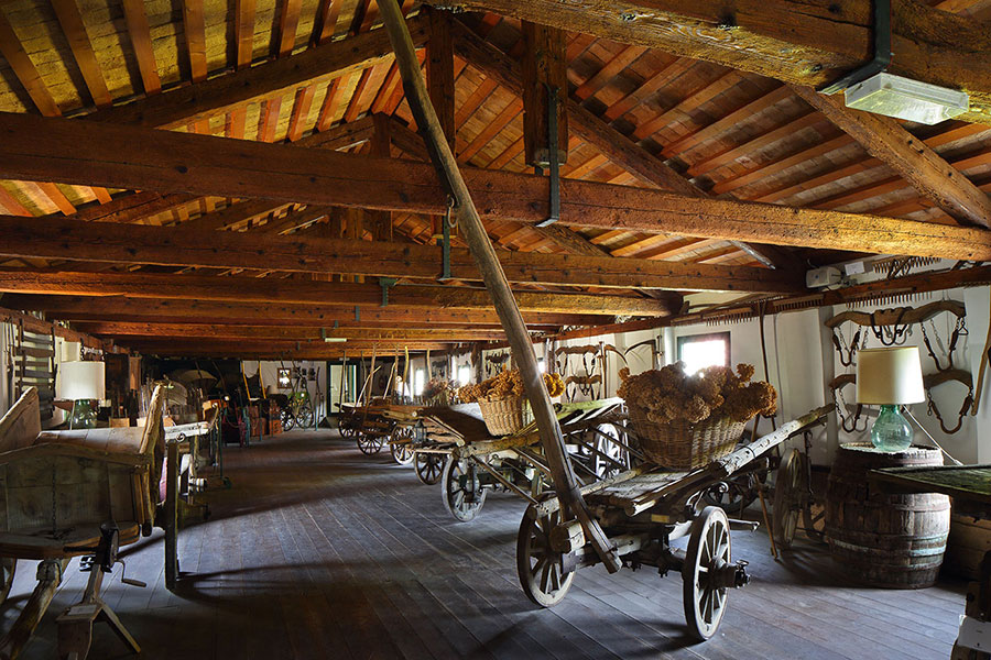 The life of women and children is described through beautiful, unremembered wooden tools and games. Carriages and carts are lined up in the long barchessa.